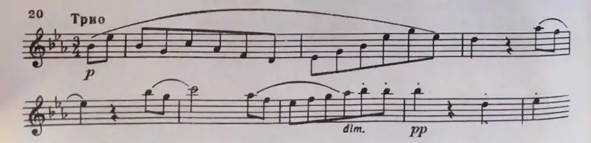 В средней части, трио, полное звучание оркестра (tutti) сменяется плавным и мягким движением струнных инструментов: