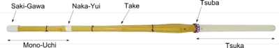 На конце бамбукобые полосы (такэ) разделяются твердым, в наше время чаще пластиковым наконечником сакигому, фиксируемым сакигава. Кожаная петелька, которая находится в месте ближнего к цуба узла цуру и крепится на цуру, называется комоно (её может и не быть)[6].