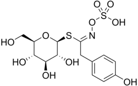 Синальбин при расщеплении мирозиназой переходит в 4-гидроксибензил-изотиоцианат. Менее острый вкус обусловлен нестойкостью этого соединения, которое распадается на 4-гидроксибензиловый спирт и тиоцианат-ион, которые не дают ощущения остроты. Время полураспада изотиоцианата зависит от кислотности среды: наибольшее время — 321 мин при pH 3, наименьшее — 6 мин при pH 6,5[2]. Глюкобрассицин является структурно связанным глюкозинолатом, который также дает неострый изотиоцианат в результате реакции с водой.
