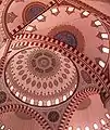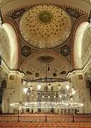 - Мечеть Сулеймание в Стамбуле была возведена Синаном в 1550-57 годах, и по мнению учёных-исследователей, является самой лучшей его работой. Проект был основан на архитектурном плане храма Святой Софии в Стамбуле, шедевре византийской архитектуры, оказавшим очень большое влияние на всё творчество Синана, который пытался превзойти этот храм в своих постройках[28]. У мечети 4 минарета, массивный центральный купол высотой 53 метра и диаметром 26,5 метров, что превосходит на 6 метров по высоте, но уступает по ширине куполу храма Айя-София. В куполе 32 отверстия, через которые проникает свет, обильно освещая интерьер мечети и придавая куполу эффект легкости. Всего в здании 136 окон. Синан здесь достиг большего единства декоративных и объемно-пространственных элементов, чем в предыдущей мечети. Линии колонн со сложным профилем, несущих паруса и купол, визуально перекликаются с богатым и дробным членением стеновой отделки. Пропорции мечети гармоничны, силуэт характеризуется изяществом и плавностью линий. Весь массив строения вписан в правильный треугольник. Минареты размещены по углам обнесённого колоннадой двора: первые два минарета находятся на более низком уровне, чем два других, которые примыкают к самой постройке. Мечеть находится на вершине холма прямо над заливом Золотой Рог. Чёткий ритм архитектурных форм хорошо воспринимается издали. Во дворе мечети находятся усыпальницы. В двух соседних тюрбе покоится сам Сулейман и его любимая жена Роксолана. Мечеть Сулеймание — одна из самых больших, когда-либо построенных в Османской империи. Помимо храма, в ней находился обширный социальный комплекс, включающий четыре медресе, библиотеку, обсерваторию, крупную больницу и медицинскую школу, кухни, хаммам, магазины и конюшни[29].