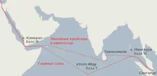 На пути следования флота были устроены запасы нефтепродуктов: в Гибралтаре, на Мальте, в Порт-Саиде, Порт-Судане, Адене, Коломбо, Тринкомали, Рангуне, Сингапуре и Гонконге[30]. Существовало важное ограничение: линейные корабли не могли пройти Суэцкий канал, будучи полностью загруженными, так что на выходе из канала они должны были дозаправиться[31]. Нефтехранилища Сингапурской базы вмещали 1 270 000 тонн топлива[32]. Кроме того, были созданы секретные базы на Камаране, атолле Адду и на острове Нанкаури[33]. Согласно расчётам флот ежемесячно требовал 110 000 тонн топлива, для перевозки которого необходимо было иметь 60 танкеров[34]. Топливо должно было поступать с нефтеперерабатывающих заводов Абадана и Рангуна, кроме того, планы предполагали закупку всей нефти, добываемой в Голландской Ост-Индии[35].