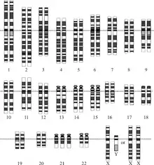 Синдром Дауна — хромосомная патология, характеризующаяся наличием дополнительных копий генетического материала 21-й хромосомы, либо целой хромосомы (трисомия), либо её участков (например, за счёт транслокации). Последствия от наличия дополнительной копии сильно различаются в зависимости от количества дополнительного генетического материала, генетического окружения и чистой случайности. Синдром Дауна встречается как у людей, так и у других видов (например, был обнаружен у обезьян и мышей). В 2005 году британские исследователи получили анеуплоидных трансгенных мышей с наличием 21-й человеческой хромосомы в дополнение к стандартному набору мышей[13]. Нормальный человеческий кариотип содержит 46 хромосом и обозначается 46,XY у мужчин и 46,XX у женщин, в то время как у носителей синдрома Дауна с трисомией по 21-й хромосоме кариотип содержит 47 хромосом.