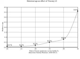 Возраст матери влияет на шансы зачатия ребёнка с синдромом Дауна. Если матери от 20 до 24 лет, вероятность этого 1 к 1562, до 30 лет — 1 к 1000, от 35 до 39 лет — 1 к 214, а в возрасте старше 45, вероятность 1 к 19. Хоть вероятность и увеличивается с возрастом матери, 80 % детей с данным синдромом рождаются у женщин в возрасте до 35 лет. Это объясняется более высокой рождаемостью в данной возрастной группе. По последним данным отцовский возраст, особенно если старше 42 лет, также увеличивает риск синдрома[8][9][10].
