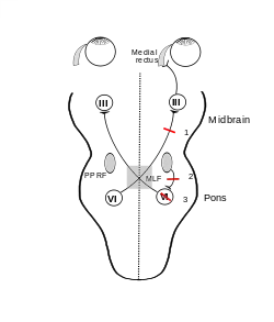 Синдром обычно возникает в результате одного одностороннего поражения парамедианного мостового ретикулярного образования и ипсилатерального медиального продольного пучка. Альтернативной анатомической причиной является поражение отводящего ядра (VI) с одной стороны (в результате сбоя ипсилатеральной абдукции глаза и аддукции противоположной глаза = паралич сопряженного взгляда в пораженной стороне), с прерыванием ипсилатерального медиального продольного пучка после пересечении средней линии от места его нахождения в контралатеральной абдукции (VI) ядра (в результате выхода из строя аддукции ипсилатерального глаза).