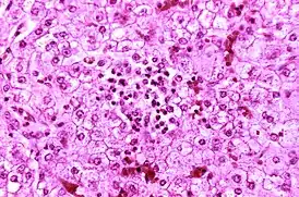 - Увеличение печени отмечается в 40 % случаев, однако желтуха наблюдается редко.