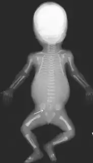 Рентгенограмма скелета ребенка с синдромом коротких рёбер-полидактилии