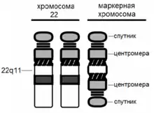 В большинстве случаев в кариотипе пациентов с синдромом кошачьего глаза имеется маленькая дополнительная маркерная хромосома. Она представляет собой дицентрическую хромосому со спутниками с обеих сторон, являющуюся инвертированной дупликацией участка 22pter→q11, обозначаемой как inv dup(22)(q11). Присутствие подобной маркерной хромосомы в кариотипе означает наличие двух дополнительных копий участка 22pter→q11, то есть частичную тетрасомию хромосомы 22. Для этого заболевания характерен мозаицизм из-за потери маркерной хромосомы во время постзиготических делений в эмбриональном развитии[1].