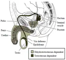 Маскулинизация мужских наружных половых органов, а также предстательной железы, зависит от андрогенного дигидротестостерона[45][46][47][48]. Тестостерон превращается в дигидротестостерон с помощью фермента 5-альфа-редуктазы[49]. Если этот фермент отсутствует или его мало, то дигидротестостерон не генерируется, и внешние мужские гениталии не развиваются должным образом[45][46][47][48][49]. Как и в случае с внутренними мужскими органами, для дигидротестостерона необходим функциональный рецептор андрогена, чтобы регулировать транскрипцию генов-мишеней, участвующих в развитии[50].