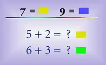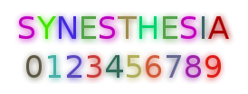 ![]() Как некто, обладающий синестезией, может воспринимать (но не «видеть») определённые буквы и цифры. Синестеты видят графемы так же, как и другие люди (в том цвете, в котором они действительно изображены), но ещё параллельно с этим они воспринимают цвет, возникающий у каждого из них. | |