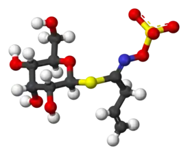 Под действием фермента мирозиназы, который содержится в семенах горчицы и корней хрена, гидролизуется с образованием молекулы глюкозы, аллилгорчичного масла (изороданистый аллил) и гидросульфата калия: