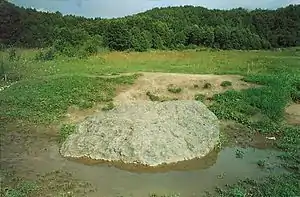 - Синий камень на небольшом бугорке на опушке леса Строга за рекой Кубрь