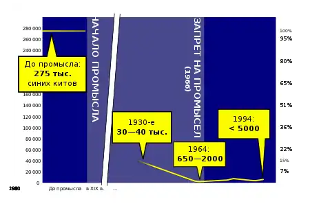 С начала XX века численность синего кита стала быстро снижаться в связи с бесконтрольным промыслом. Китобоев привлекал огромный размер туши этого животного — от одного кита можно было получить намного больше жира и мяса, чем от любого другого китообразного. К 1960-м годам синий кит был практически истреблён и оказался на грани полного исчезновения — в 1963 году оставалось не более 5000 особей[15]. В настоящее время, несмотря на принятые меры охраны, синий кит по-прежнему очень редок — общая численность не превышает 10 000 особей, и для поддержания его стабильного поголовья требуются новые охранные мероприятия. Основную угрозу для китов представляет антропогенный фактор, выражающийся в нарушении их привычного образа жизни и загрязнении морей. Медленное естественное воспроизводство синих китов также значительно препятствует росту их популяции.