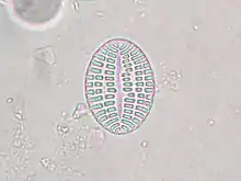 В районах нагула, в холодных водах синий кит (это свойственно и другим усатым китам) обрастает микроскопическими диатомовыми водорослями, в основном, Cocconeis ceticola[13], которые образуют на его коже плёнку, придающую окраске кита зеленоватый оттенок. Этот водорослевый налёт исчезает, когда кит возвращается в более тёплые воды[7]. Из-за этого обрастания брюхо синего кита иногда приобретает желтоватый цвет[28], который может быть довольно ярким, даже горчичного оттенка[29]. Мёртвый синий кит плавает обычно брюхом вверх, поэтому он хорошо виден с большого расстояния[10].