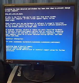 Синий экран смерти (англ. Blue Screen of Death, Blue Screen of Doom, BSoD) — жаргонное название сообщения о критическом сбое в операционных системах Microsoft Windows. Существует несколько видов сообщений BSoD: для Windows 9x, Windows NT и Windows CE. Его исходный текст находится в ядре Windows.