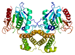 Синтазы жирных кислот млекопитающих являются димерными белками и состоят из двух одинаковых полипептидных цепей. Каждый мономер включает 3 каталитических домена на N-конце (кетоацилсинтаза (KS), малонил-ацетилтрансфераза (MAT) и дегидратаза (DH)) и 4 домена на C-конце (еноилредуктаза (ER), кетоацилредуктаза (KR), ацилпереносящий белок (ACP) и тиоэстераза (TE)). Эти два структурных кластера разделены большим центральным регионом (около 600 аминокислот).