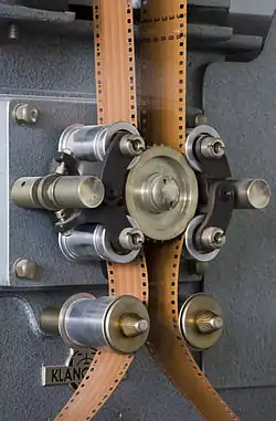 - Магнитная запись на отдельный магнитофон. В первые десятилетия после появления магнитной записи в кинопроизводстве использовалась перфорированная 16 или 35-мм магнитная лента сплошного полива[8][9][* 1]. Запись на неё производилась по такой же технологии, как и оптическая: синхронизация с киноплёнкой осуществлялась использованием общего источника переменного тока синхронных электродвигателей, поскольку для магнитной ленты была выбрана та же скорость, что и для киноплёнки — 456 мм/с[11][12]. Использование зубчатых барабанов в магнитофонах считалось обязательным для точной синхронизации, поскольку исключало проскальзывание ленты. Впоследствии при первичной записи от них отказались в пользу пилот-тона («магнитной перфорации»), записываемого на узкую магнитную ленту шириной 6,25 мм вместе со звуком. Самым распространённым устройством для такого способа записи несколько десятилетий оставались магнитофоны Nagra. Исходная фонограмма в дальнейшем копировалась на перфорированную магнитную ленту, более удобную для монтажа[13][14][15]. Записанный на узкой ленте сигнал пилот-тона использовался при этом для принудительной синхронизации при копировании на новый носитель[16]. Дальнейшим развитием этой технологии стало использование в камерах и магнитофонах приводов с кварцевой стабилизацией, обеспечивающих высокую точность синхронизации без электрической связи между устройствами[8]. Полученная такими способами магнитная синхронная фонограмма после монтажа переводилась в оптическую и так же использовалась для печати совмещённых фильмокопий.