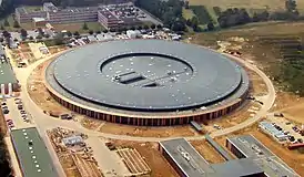 Синхротро́н (от синхронизация + электрон) — один из типов резонансных циклических ускорителей. Характеризуется тем, что в процессе ускорения частиц орбита пучка остаётся постоянного радиуса, а ведущее магнитное поле поворотных магнитов, определяющее этот радиус, возрастает во времени. Кроме того, остаётся постоянной частота ускоряющего электрического поля (в отличие от синхрофазотрона). Понятно, что для пучков ультрарелятивистских частиц период обращения определяется только длиной орбиты, и поскольку она не изменяется, то нет необходимости изменять частоту электрического поля. Поэтому все резонансные циклические ускорители лёгких частиц (электронов и позитронов), а также высокоэнергетические протонные и ионные машины, такие как LHC и Тэватрон — это синхротроны. В синхротроне достигнуты энергии около 6,5 ТэВ для протонов (LHC) и более 100 ГэВ для электронов (LEP). Дальнейшее повышение энергии в электронных синхротронах требует сильного увеличения их размеров вследствие огромных потерь энергии на излучение. Потеря энергии за один оборот пропорциональна 4-й степени энергии частиц: W ~ E4/R.
