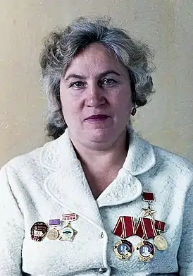 11 марта 1976 года удостоена звания Героя Социалистического Труда — за выдающиеся успехи в выполнении заданий 9-го пятилетнего плана и принятых социалистических обязательств.