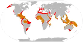 ![]() Доисторический ареал Современный ареал |