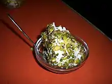 | Кнафе (كنافة) | Десерт из кондитерских изделий на шнурках, фаршированный сладким белым сыром, орехами и сиропом[26] |