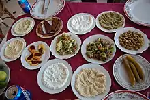 Меззе — набор закусок, которые обычно подаются вместе с арабским хлебом до основного блюда в сирийской кухне, за ним следует кофе со сладкими кондитерскими изделиями и / или фруктами[18].