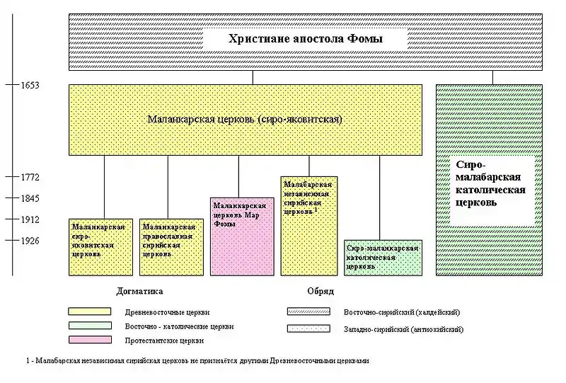 Напротив, Маланкарская церковь в дальнейшем пережила целую череду расколов, в результате которых к концу XX века из неё образовались пять церквей западно-сирийского обряда: Древневосточные Маланкарская сиро-яковитская церковь и Маланкарская православная сирийская церковь, восточнокатолическая сиро-маланкарская церковь, испытавшая большое влияние англиканской доктрины Маланкарская церковь Мар Фомы и маргинальная и непризнаваемая другими церквами мира (включая древневосточные) Малабарская Независимая Сирийская церковь.