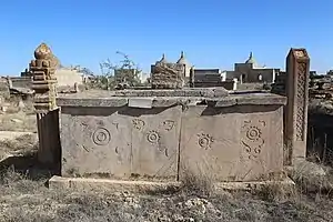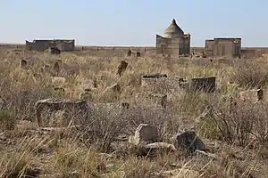 - В центре древней части некрополя. Каменная ограда с надгробиями, стелками и остатками шестов-тугов. Сейчас отмечена как могила некоего «Саназар-ата». Этот вариант соответствует ранним сведениям Г. С. Карелина 1832 года и обследованиям М. М. Мендикулова 1950-х годов. Эту версию также подтверждает топография старой части некрополя — определённое соблюдение принципа «гонам баши» («ближе к святой могиле») при размещении надгробий[1].