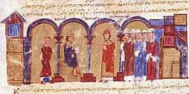 ![]() Встреча императора Василия II и Сисиний II. Иллюстрация из Мадридской хроники Скилицы | ||