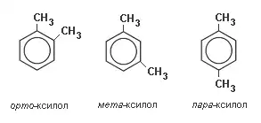 Второй гомолог C8H10, может существовать в четырёх формах: этилбензол C6H5-C2H5 и три диметилбензола (ксилола) с химической формулой C6H4(CH3)2 (орто-, мета-, пара-ксилол, или 1,2-, 1,3-, 1,4-диметилбензол)[1].