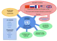 Главным органом системы ООН является сама Организация Объединенных Наций. Она состоит из шести главных органов, учрежденных Уставом Организации Объединенных Наций[3]: