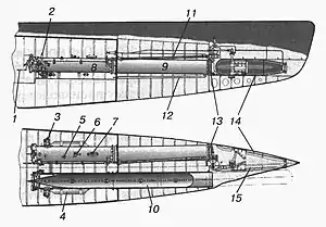 1 — розмах открывания передней крышки; 2 — предохранительный клапан; 3 — невозвратный клапан; 4 — боевой баллон; 5 — горловина установки хода торпеды; 6 — курковой зацеп; 7 — горловина над впускным и запирающим клапанами торпеды; 8 — задняя труба (внутри ПК); 9 — передняя труба (снаружи ПК); 10 — торпеда; 11 — привод открывания передней крышки и волнорезного щита; 12 — труба системы осушения и вентиляции; 13 — передняя крышка; 14 — волнорезный щит; 15 — волнорезный щит в «утопленном» (боевом) положении