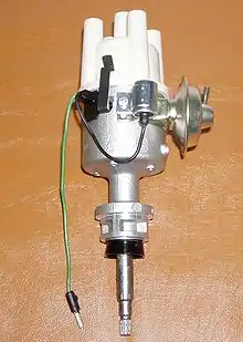 Распределитель зажигания (обиходное название — «трамблёр») — высоковольтный переключатель, бегунок которого получает вращение от распределительного вала двигателя, подключает катушку зажигания к нужной в данный момент свече. Обычно исполняется в одном корпусе и на одном валу с прерывателем/датчиком положения вала. Состоит из подвижного контакта (бегунка) и крышки, к которой подключаются один высоковольтный провод от катушки и несколько — далее к свечам.