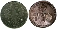 В начале XVIII века иногда применялась смешанная система записи чисел, состоящая и из кириллических, и из арабских цифр. Например, на некоторых медных полушках (монетах достоинством ¼ копейки) отчеканена дата 17К (1720) и 17К1 (1721).