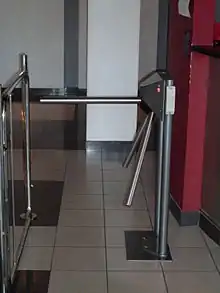 - Турникеты — используются на проходных предприятий, общественно значимых объектах (стадионы, вокзалы, метро, некоторые госучреждения) — везде, где требуется организовать контролируемый проход большого количества людей. Турникеты делятся на два основных типа: поясные и полноростовые. Если рядом с турникетом нет быстро открывающегося свободного прохода (на случай пожара), поясной турникет должен быть оборудован т. н. планками «антипаника» — планками, переламывающимися усилием нормального человека (требование пожарной инспекции).