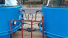 - Многие трамвайные вагоны, например «Татра Т3», ЛМ-68М, ЛВС-86 и 71-605, можно сцепить по системе многих единиц хвостами. Получившиеся поезда в некоторых городах использовались как челноки при ремонтах пути. Например, в Бийске с 1998 по 2002 годы, когда состояние моста через реку Бия не позволяло осуществлять по нему движение трамваев, четыре таких поезда в течение 4 лет работали на левобережной части. В Москве сцепленные хвостами двухвагонные поезда из модернизированных «татр» — МТТА-2 — использовались на трассе 9-го маршрута с 2012 по 2017 год: конечная остановка на Лесной улице, после разбора путей разворотного кольца в 2008 году, была организована как оборотный тупик со съездами[68].