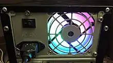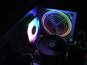 Блок питания компьютера также имеет вентилятор, подключаемый непосредственно к его плате через разъём. Внутри блока питания на высоковольтных транзисторах и низковольтных диодных выпрямителях, установлены радиаторы охлаждения, поскольку данные компоненты являются одними из самых нагревающихся. Классические импульсные блоки питания имеют либо задний вентилятор на выдув, либо нижний на вдув. Последний размещается на кожухе внутри корпуса системного блока. Вентиляторы различаются размерами: на выдув — 80 мм, на вдув — 120 мм. Иногда в ходе апгрейда энтузиасты заменяют штатные вентиляторы на вентиляторы с подсветкой, чтобы украсить сборку.