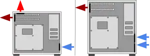 Чем холоднее применяемая охлаждающая среда (воздух), тем эффективнее охлаждение. Более стратегически размещение вентиляторов улучшает воздушный поток внутри корпуса и, таким образом, снижает общую внутреннюю температуру внутри корпуса. Использование более крупных вентиляторов также повышает эффективность и снижает уровень шума. В руководстве AMD по системам охлаждения указывается, что применение переднего вентилятора не так существенно и в некоторых тестах в экстремальных ситуациях этот вентилятор способствует рециркуляции горячего воздуха больше чем привнесению холодного воздуха[3].
