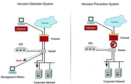 Поведение Системы обнаружения вторжения (слева), поведение Системы предотвращения вторжения (справа). - IPS для беспроводных сетей (Wireless Intrusion Prevention Systems, WIPS): проверяет активность в беспроводных сетях. В частности, обнаруживает неверно сконфигурированные точки беспроводного доступа к сети, атаки человек посередине, спуфинг mac-адресов.