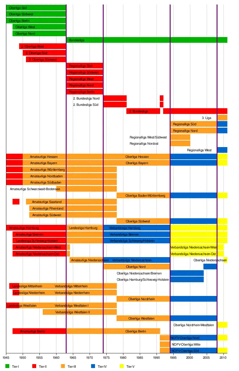 Структура лиги неоднократное количество раз менялась, и, как правило, отражает степень вовлеченность в занятия спортом в различных регионах страны. В начале 1990-х изменения были вызваны объединением Германии и последовавшей интеграцией национальных лиг Восточной и Западной Германии. Все перечисленные выше уровни лиг связаны между собой правилами выбывания в нижнюю лигу и продвижения вверх.