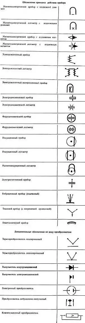 Применение устройств в конструкции прибора для астатизма, термоэлектрического преобразования, выпрямителей и усилителей обычно обозначается специальными символами нанесёнными на шкалу прибора, дополняющий основной символ типа системы измерительного прибора.