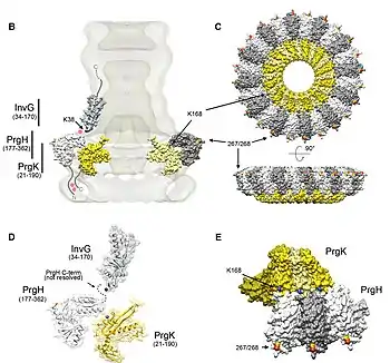 В 2012 году сочетание рекомбинантного производства игольчатых комплексов дикого типа, твердотельной ЯМР спектроскопии, электронной микроскопии[34] и моделирования биополимеров Rosetta выявило супрамолекулярные границы раздела и, в конечном итоге, полную атомную структуру иглы T3SS Salmonella typhimurium[35]. Было показано, что субъединицы PrgI, состоящие из 80 аминокислотных остатков образуют правосторонний спиральный узел с примерно 11 субъединицами, приходящимся на два оборота спирали, аналогично жгутику Salmonella typhimurium. Модель также выявила расширенный аминоконцевой домен, который расположен на поверхности иглы, в то время как высококонсервативный карбокси-конец направлен в просвет[35].