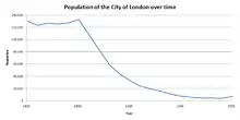 По данным, опубликованным Office for National Statistics, в 2011 году в Сити проживало около 7 000 человек;[45] примерно столько же проживало во время переписи в 2001 году.[46] В 2001 году этнические группы в составе населения распределялись так: 84,6 % — белые, 6,8 % — индо-пакистанцы, 2,6 % — чёрнокожие, 2,3 % — смешанные расы, 2,0 % — китайцы и 1,7 % — остальные группы.[46] Справа представлен график численности населения Сити с 1801 года на основе десятилетних переписей. В первой половине XIX века численность стабильно держится на уровне 120 000—140 000 человек, однако она резко снизилась с 1851 по 1991 год и лишь немного возросла между 1991 и 2001 годом. Единственное заметное изменение с 1801 года произошло в 1994 году.