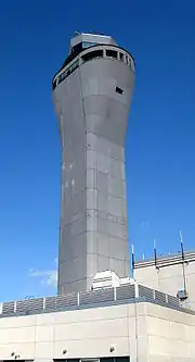 Строительство новой вышки командно-диспетчерского пункта аэропорта началось в 2001 года и закончено в ноябре 2004 года, общая стоимость работ при этом составила 26 млн долларов США[8]. Диспетчерский зал КДП находится на высоте 71 метра над землёй, а общая высота вышки вместе с антеннами составляет 82 метра. Зал диспетчеров имеет площадь 79 квадратных метров и первоначально был рассчитан на десять с возможностью расширения до пятнадцати диспетчерских мест. Прежняя диспетчерская вышка, возведённая в 1950-х годах, в настоящее время находится на территории пассажирского терминала и используется для управления наземным движением в аэропорту (эта вышка была разрушена катастрофическим землетрясением 2001 года и впоследствии восстановлена).