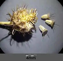 Цветки в одиночных верхушечных головках 2—3 см в диаметре. Обёртка из линейных листочков, короче цветков. Венчики бледно-жёлтые, пятилопастные, с внешней стороны несколько опушённые, срединные 5—7 мм длиной, краевые — вдвое крупнее.