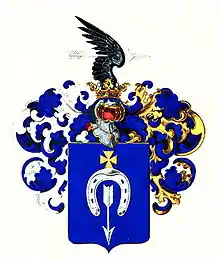 Описание герба: Выдержка из Общего гербовника В лазуревом щите серебряная подкова шипами вниз. На ней золотой с широкими концами крест. Внутри подковы вертикально серебряная стрела острием вниз. Над щитом дворянский коронованный шлем. Нашлемник — черное крыло коршуна, пронзенное серебряной стрелой влево. Намет справа лазуревый с серебром, слева лазуревый с золотом. |