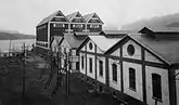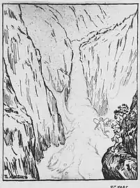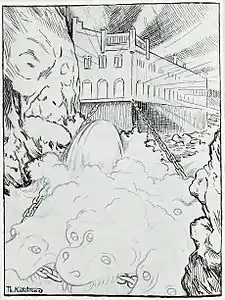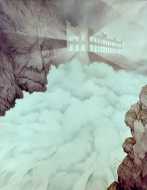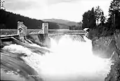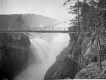 ![]() Гидроэлектростанция Свельгфос I (Svælgfos I). Введена в эксплуатацию в 1907 г. Прекратила эксплуатироваться в 1958 г. Снесена в 1980-е годы. Фото Anders Beer Wilse, 1911 год | ![]() Т. Киттельсен. «Троллей укротили» (Trollene er temmet). Эскиз к рисунку «Водопад Свельгфос», 1907 |