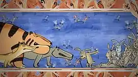 Давным-давно были времена, когда тигры, волки и лисы охотились вместе. Сообща у них охота очень удачно получалась. Так удачно, что остальных зверей становилось всё меньше и меньше. В конце концов остались в лесу только зайцы. И тогда старый заяц вскричал, обращаясь к хищникам: «Стойте! Подождите! Если мы сейчас все умрём, то что же вы потом есть будете? Давайте мы лучше сами к вам будем приходить по очереди.» Тигр прорычал: «Сами предложили.» А ёж спросил: «Ну и как выбирать будете?» Старый заяц ответил: «С помощью считалки.» И стали зайцы приходить сами… Но жить всем хочется. И вот один отчаянный заяц взял с собой жгучий перец, сунул его в открытую пасть тигра и убежал, пользуясь суматохой. Разозлившийся тигр убил волка, а лис сам сбежал. Догнал лис сбежавшего зайца и предложил план спасения. Самый старый заяц пришёл к тигру и сказал: «Уважаемый, не будет тебе больше зайцев. Все пошли к другому тигру, он тебя сильнее, все теперь его боятся.» Тигр зарычал: «Где он? Показывай дорогу.» Когда пришли старый заяц заявил: «Он в колодец спрятался, услышал наверное что ты идёшь.» Тигр заглянул в колодец, увидел злую тигриную морду и бросился на «конкурента», не подумав, что это его собственное отражение. Лис прибежал, надвинул крышку на колодец, сел на неё и хотел схватить одного зайца. Но заяц толкнул крышку, и лис тоже провалился в колодец. А что было с зайцами дальше, это уже история для нового ковра с другим узором.