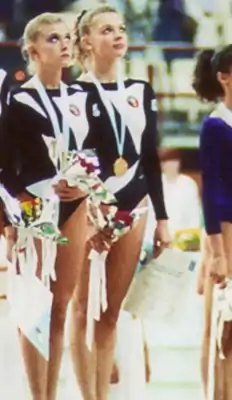 ![]() Скалдина (справа) на Чемпионате мира по художественной гимнастике 1991 г. | |