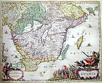 Map of ca. 1635 by Cartographer J. Janssonius, Amsterdam, showing «Gothia» and surrounding «lands» or provinces.