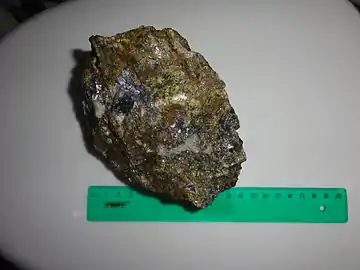 Структура: кристаллическая, зернистая, бластовая. Текстура: массивная, неоднородная, пятнистая.